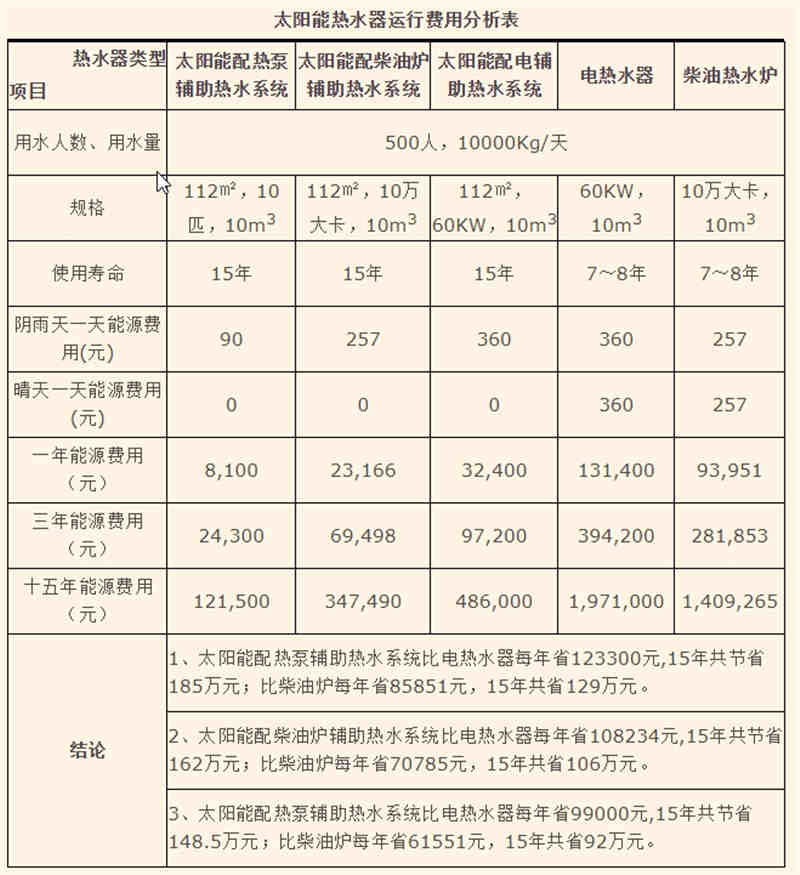 太陽(yáng)能按輔助加熱的不同可分為太陽(yáng)能配熱泵輔助加熱系統(tǒng)、太陽(yáng)能配柴油爐輔助加熱系統(tǒng)、太陽(yáng)能配電加熱輔助加熱系統(tǒng)。由于一年有90天左右的時(shí)間為陰雨天,需要用到輔助加熱,那么采用不同的輔助加熱使得太陽(yáng)能系統(tǒng)全年運(yùn)行費(fèi)用產(chǎn)生較大的差異。