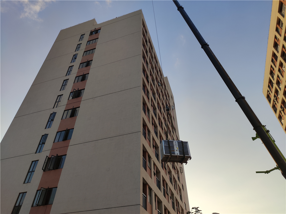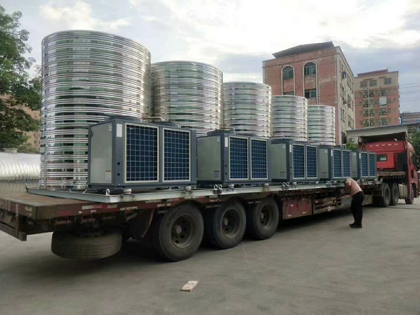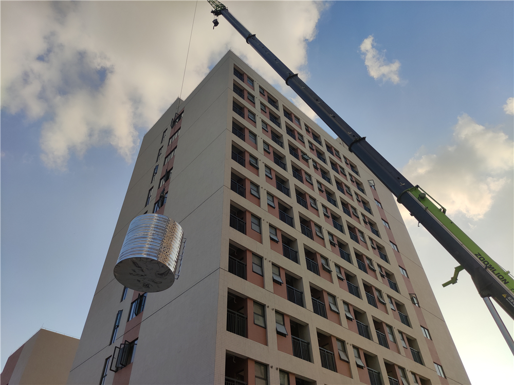 赫派空氣能熱泵,不銹鋼保溫水箱等設備到場吊裝到樓頂