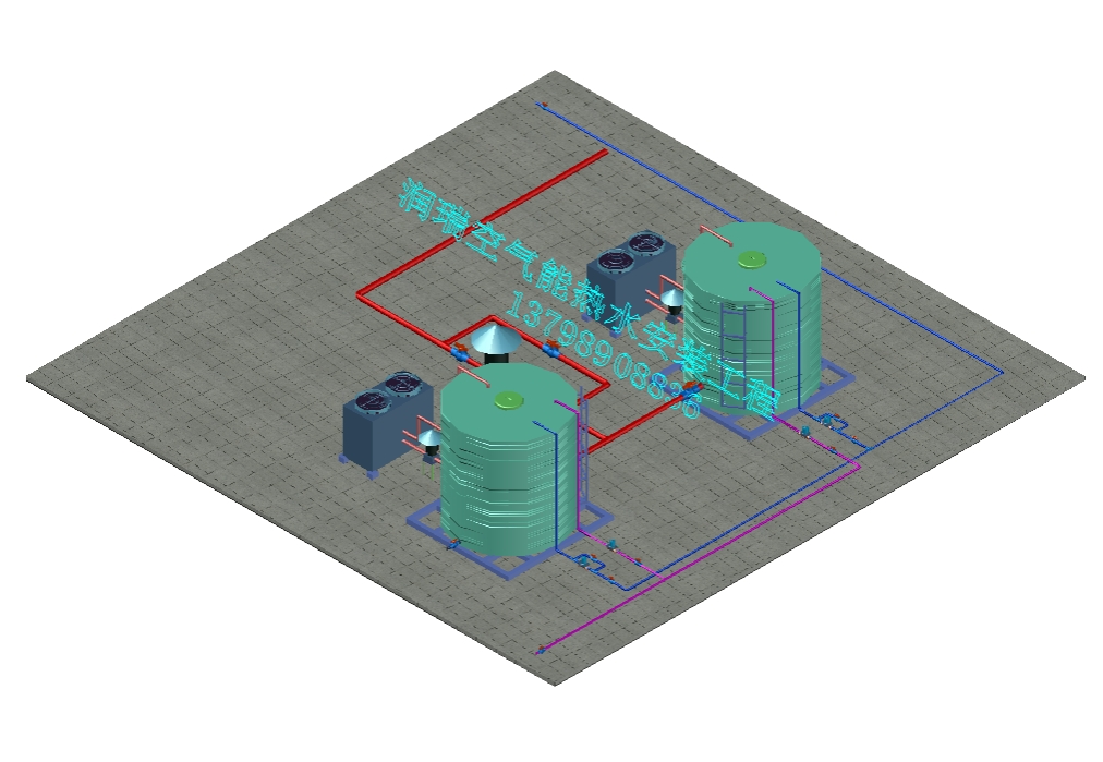空氣能熱泵和兩個10m³的立式不銹鋼保溫水箱,(水箱有效容量為18m³)就可以完全滿足酒店的熱水需求。不銹鋼水箱帶底座和爬梯。