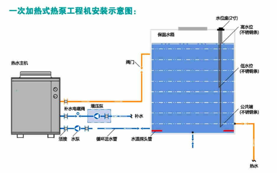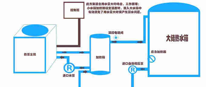 自來水經“空氣能”熱水機一次加熱到60℃,供水及時,即使冬季水箱溫度下降時,系統(tǒng)自動進入循環(huán)加熱,提升水箱溫度,保證水箱隨時都有熱水供應。