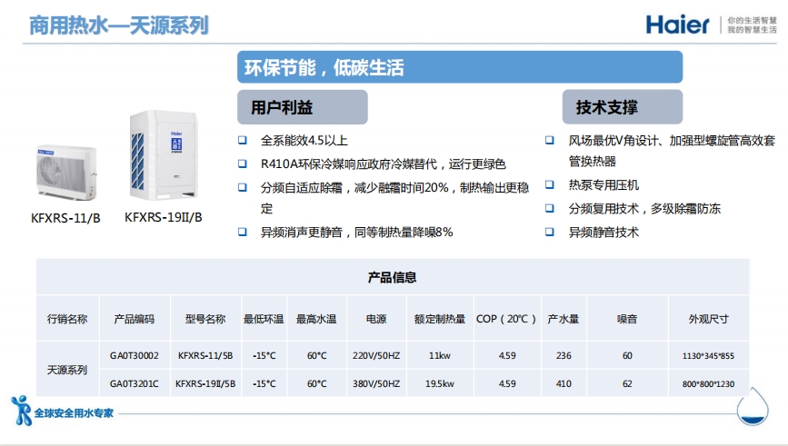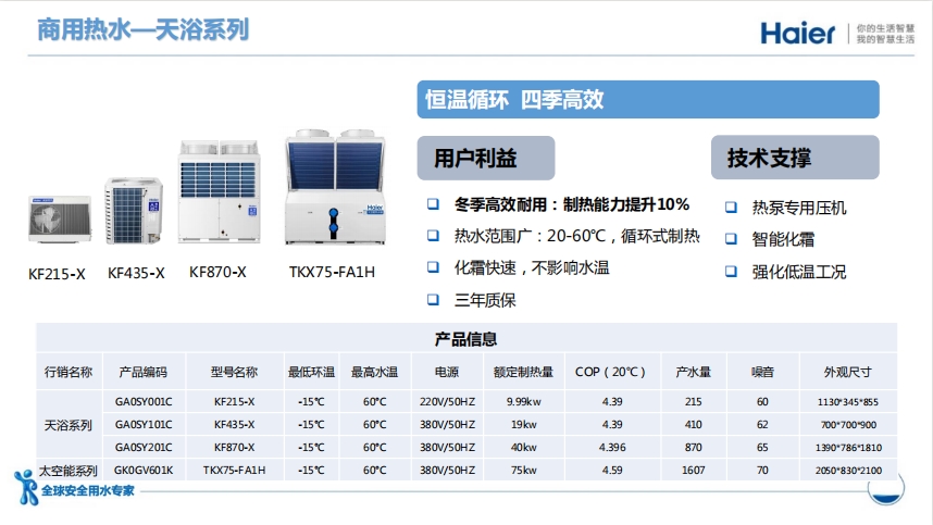 目前,海爾空氣能在全屋領域實現全面引領,主打智慧健康用水,場景需求迭代,根據細分場景精準定位推出相應的解決方案及產品,如驕陽系列變頻噴氣增焓采暖機、卡薩帝80°C高水溫系列、cop6.0高能效系列、海爾高效變頻王系列等,實現全屋用水不等待、多點用水即開即熱、超大水量全家暢享、全屋采暖一臺解決等差異化場景,各類用戶都可享受到綠色節能的熱水體驗。