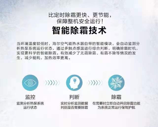 海爾空氣能熱水器全系列采用智能除霜,自動監測分析熱泵系統運行狀態,通過多觸點感溫進行綜合判斷,明確除霜時機,有效避免了”無霜除霜“或者”有霜不除“,加熱效率更高。