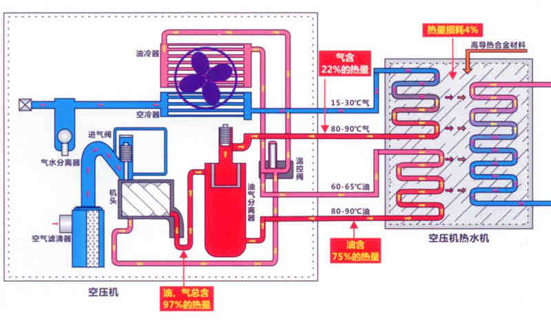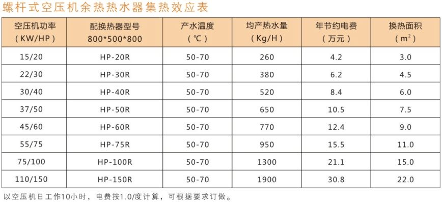 赫派空壓機余熱回收熱水器裝置能將螺桿式空壓機壓縮產生的大部分熱能進行回收利用,轉化為生產和生活所需的熱水。幫助企業節約能源消耗,減少二氧化碳的排放,具有良好的經濟、環境和社會效應
