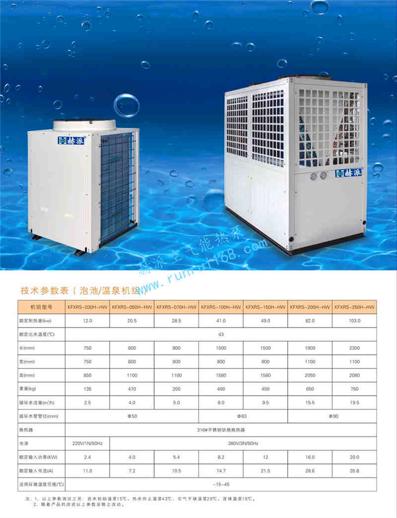赫派空氣能溫泉熱泵機(jī)組是專門(mén)針對(duì)各種溫泉池、SPA池、桑拿池等設(shè)計(jì)的機(jī)組,使用水的溫度一般高于泳池水溫,所以出水溫度不超過(guò)45℃(特殊要求可以設(shè)定加熱到80度)。此系列機(jī)組的冷凝器使用鈦管和PPR材料制作,能有效地抵抗氯離子的腐蝕和減少溫泉水的水垢形成。