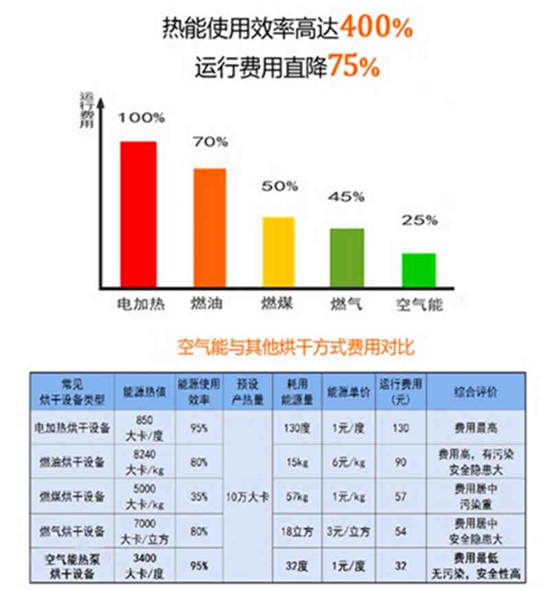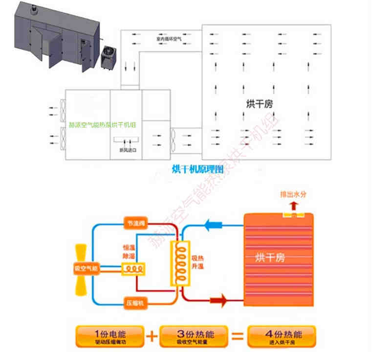 赫派空氣能熱泵烘干機只需要少量的電能來驅動壓縮機,并通過壓縮機從空氣中吸收大量的熱能,通過循環風機搬運到烘干房,不斷的循環快速升溫(烘干房內可調溫度為:8℃-80℃,可調濕度:5%-95%),再利用二次廢熱回收除濕裝置排濕,從而達到物料烘干的目的。采用微電腦智能控溫控濕,烘干過程無需專員看守、無任何污染物排放,運行電費低,是一種節能環保的烘干解決方案。
